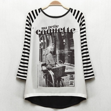 平價流行服飾推薦 ~ 時尚伊人 歐美風條紋袖雪紡印舒適百搭圓領上衣-ML 分享美好平價時尚衣著讓你天天帶著自信出門 特價,優惠〄〄